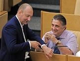 Заместитель председателя комитета Государственной думы (ГД) России по делам национальностей Михаил Старшинов (слева) и член комитета ГД по международным делам Семен Багдасаров (справа) во время пленарного думского заседания.