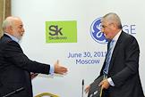 Президент и главный исполнительный директор GE International в России и СНГ Рон Поллетт (слева) и главный исполнительный директор GE International Джефф Иммельт (справа) на церемонии подписания соглашения между компаниями General Electric (GE) и "Сколково". Церемония прошла в гостинице "Ritz Carlton Москва".