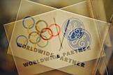 Пресс-конференция компании General Electric (GE) и Международного олимпийского комитета прошла в гостинице "Ritz Carlton-Москва". Флажки с символикой олимпиады и компании General Electric (GE).
