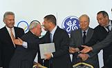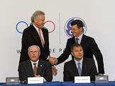 Президент департамента корпоративных продаж и финансирования Олимпийских игр Питер Фосс (слева на первом плане), директор Международного олимпийского комитета по телевещанию и маркетингу Тимо Лумми (справа на первом плане), председатель совета директоров, главный управляющий компании General Electric Джеффри Иммельт (слева на втором плане) и заместитель председателя правительства России Дмитрий Козак (справа на втором плане) на пресс-конференции компании General Electric (GE) и Международного олимпийского комитета в гостинице "Ritz Carlton-Москва".