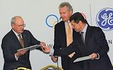 Слева направо: президент департамента корпоративных продаж и финансирования Олимпийских игр Питер Фосс, председатель совета директоров, главный управляющий компании General Electric Джеффри Иммельт и заместитель председателя правительства России Дмитрий Козак на пресс-конференции компании General Electric (GE) и Международного олимпийского комитета в гостинице "Ritz Carlton-Москва".