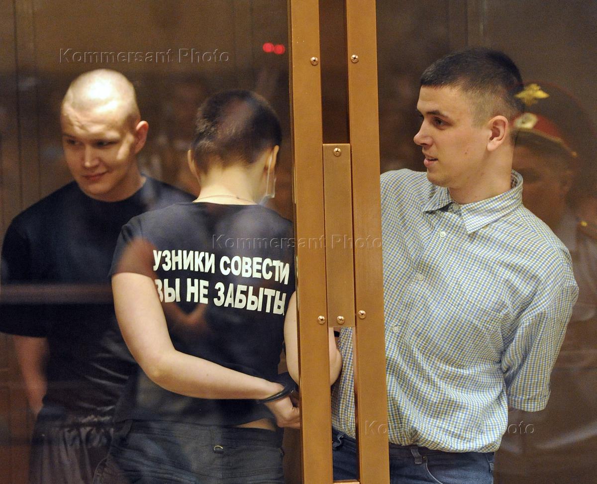 Член группировки "Национал-социалистическое общество" (НСО) Василиса Ковалева (вторая справа) и Виктор Апполонов (справа) во время вынесения обвинительного приговора по делу в отношении 13 членов НСО. Заседание прошло в Мосгорсуде.