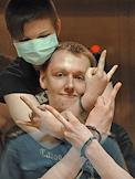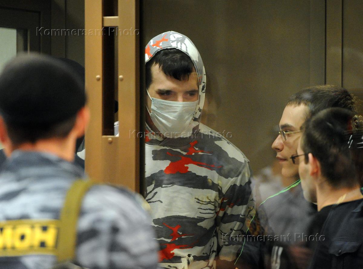 Член группировки "Национал-социалистическое общество" (НСО) Виктор Апполонов (в центре) перед вынесением обвинительного приговора. Заседание прошло в Мосгорсуде.