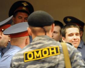 Лидер группировки "Национал-социалистическое общество" (НСО) Лев Молотков (в центре) после вынесения обвинительного приговора по делу в отношении 13 членов НСО. Заседание прошло в Мосгорсуде.