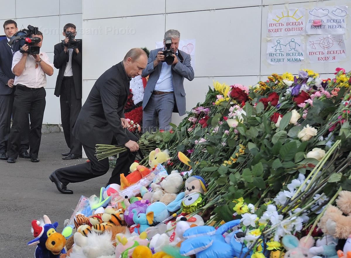 Председатель правительства России Владимир Путин во время возложения цветов к месту памяти погибших в результате крушения теплохода "Булгария".