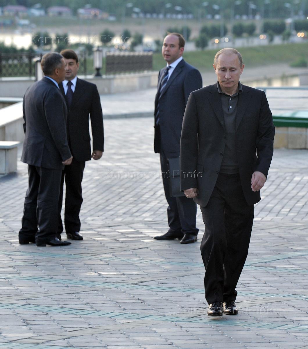 Слева направо: председатель правительства России Владимир Путин, руководитель протокола председателя правительства России Антон Вайно и президент Республики Татарстан Рустам Минниханов во время возложения цветов к месту памяти погибших в результате крушения теплохода "Булгария".