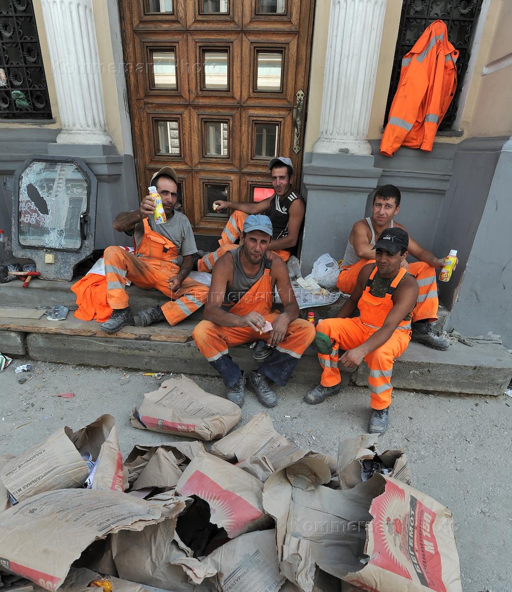 Жанровая фотография. Укладка тротуарной плитки в Леонтьевском переулке. Рабочие во время обеденного перерыва.