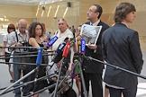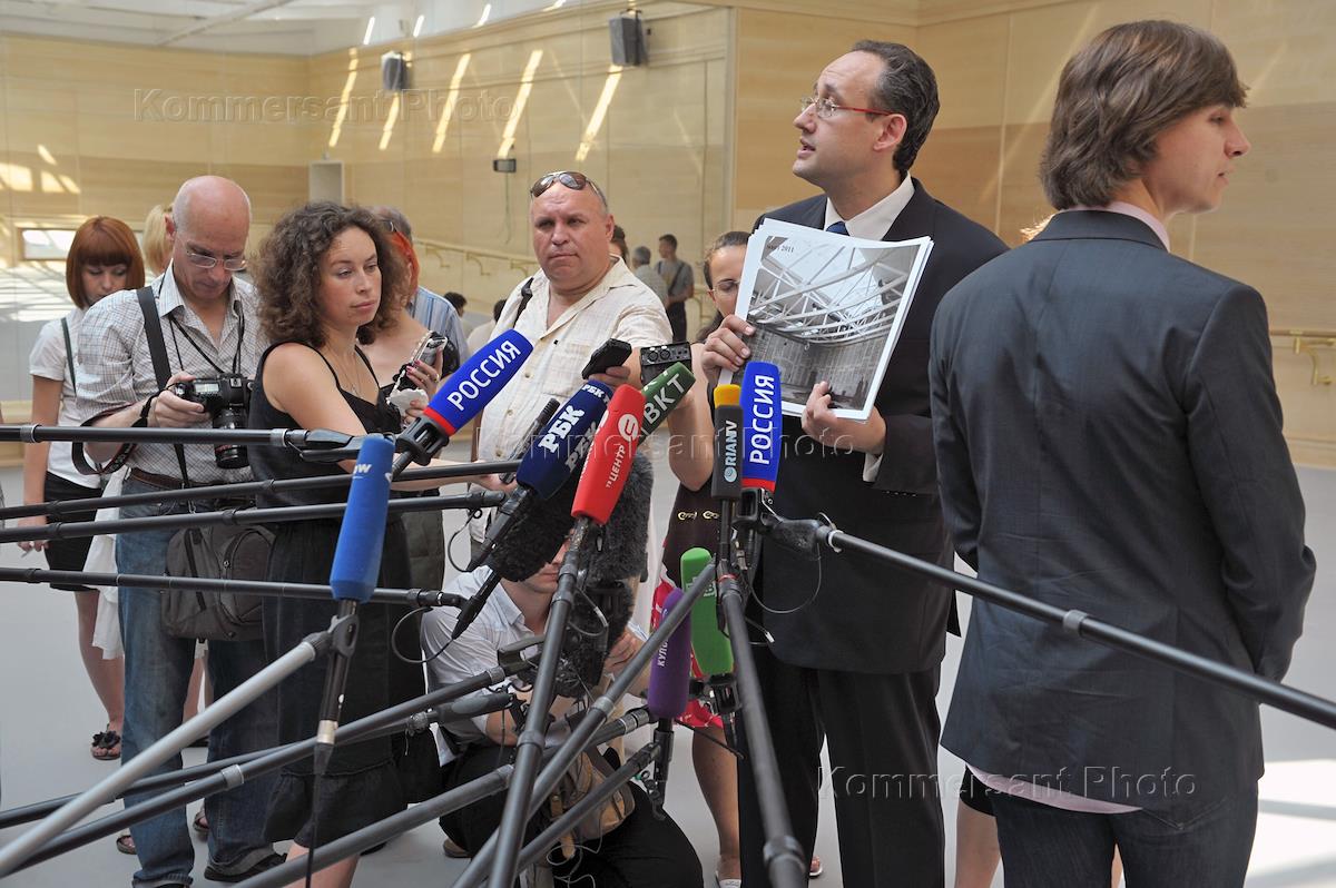 Реконструкция Большого театра. Официальный представитель генерального подрядчика директор Департамента по связям с общественностью Инвестиционной группы "Сумма Капитал" Михаил Сидоров (в центре) и художественный руководитель балетной труппы Сергей Филин (справа) во время встречи с журналистами в театре.