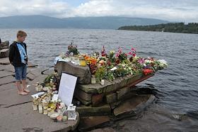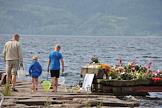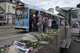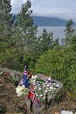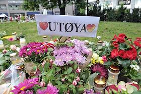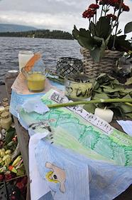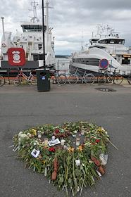 Виды Осло. Указатель на остров Утойя. Цветы, принесенные местными жителями в память о погибших в результате двойного террористического акта, произошедшего в центре Осло и на острове Утойя 22 июля 2011 года.