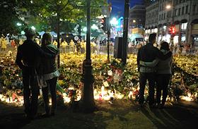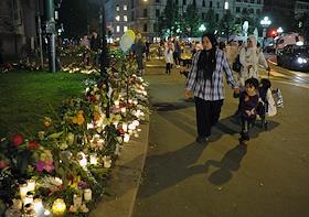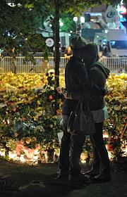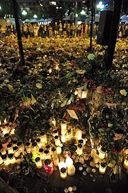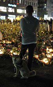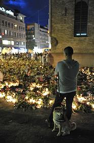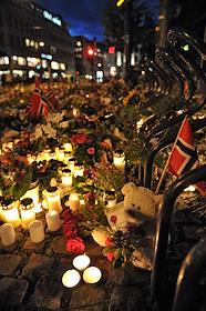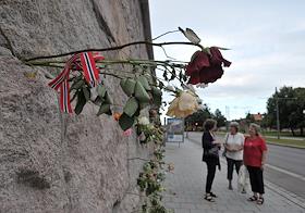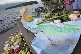 Местные жители приносят цветы и зажигают свечи в память о погибших в результате двойного террористического акта, произошедшего в центре Осло и на острове Утойя 22 июля 2011 года.