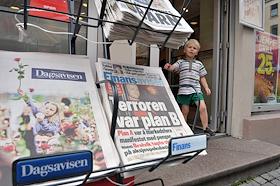 Двойной террористический акт произошел в центре Осло и на острове Утойя 22 июля 2011 года. Продажа прессы, посвященные этому событию.