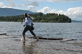 Жанровая фотография. Фотограф идет по берегу озера Турифьорд. Вид на остров Утойя.