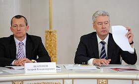 Заместитель мэра Москвы по вопросам экономической политики Андрей Шаронов (слева) и мэр Москвы Сергей Собянин (справа) на встрече с представителями бизнеса в сфере торговли и услуг. Встреча прошла в мэрии Москвы.