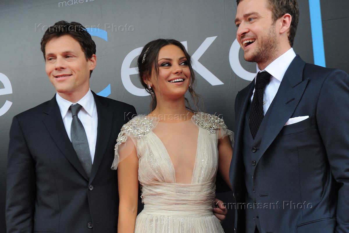 Слева направо: режиссер Уилл Глак, актеры Мила Кунис и Джастин Тимберлейк на премьере фильма "Секс по дружбе" в кинотеатре "Октябрь".