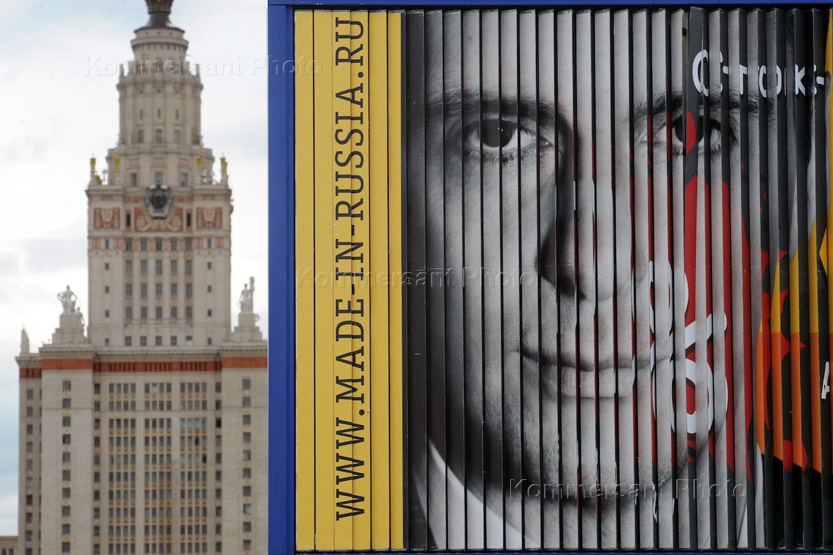 Рекламный плакат с портретом лидера партии "Правое дело" Михаила Прохорова на Третьем транспортном кольце. Надпись "Россия - страна возможностей".