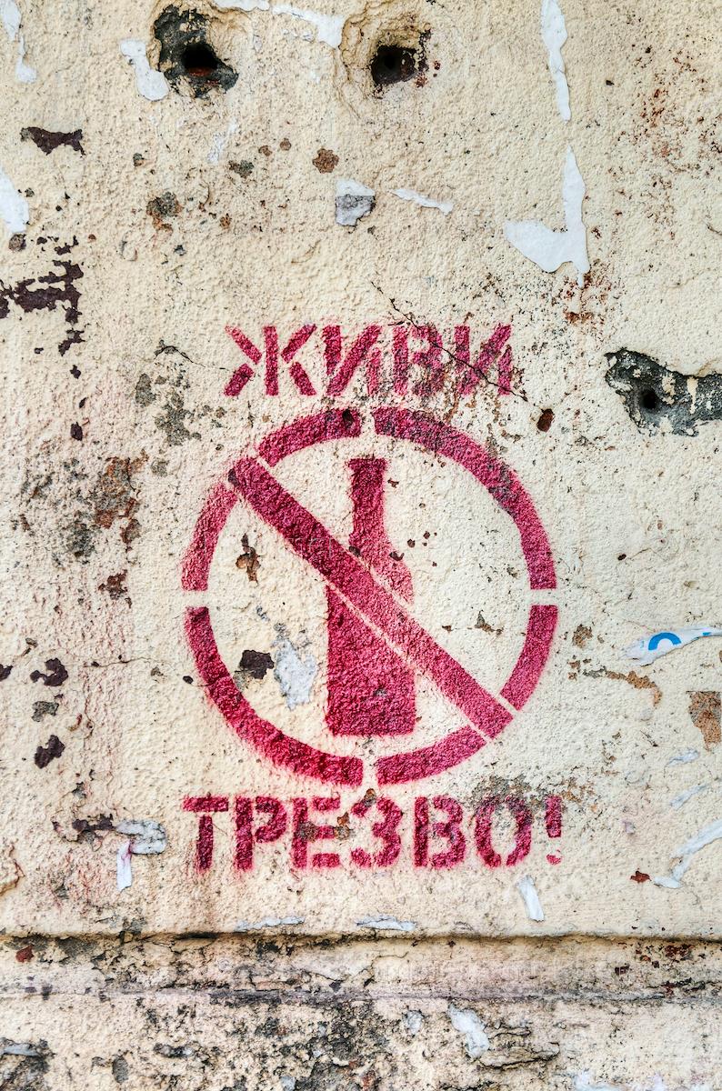 Genre photo. Drawing a crossed bottles and labels, "Live sober!" on the wall.