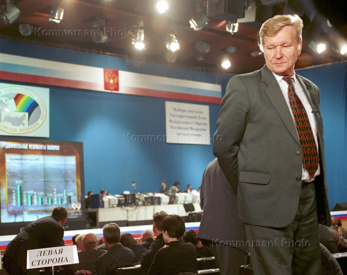 Leader Our Home/ Russia vladimir Ryzhkov in Ostankino TV center before Duma elections results announsment.