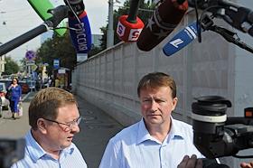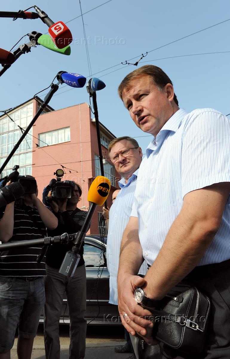 Бывший губернатор Тульской области Вячеслав Дудка (справа), в отношении которого возбуждено уголовное дело о взяточничестве, отвечает на вопросы журналистов перед допросом в Следственном комитете России.