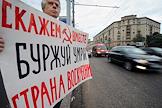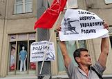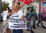 Акция протеста "Живая цепочка" против "разрушения великой державы СССР", организованная партией КПРФ, прошла на Ленинском проспекте от улицы Академика Петровского до площади Гагарина. Плакат "Путин! Медведев! Куда вы ведете страну?!!".