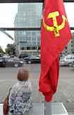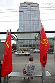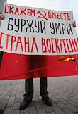 Акция протеста "Живая цепочка" против "разрушения великой державы СССР", организованная партией КПРФ, прошла на Ленинском проспекте от улицы Академика Петровского до площади Гагарина. Плакат "Скажем вместе - буржуй умри, страна воскресни!".
