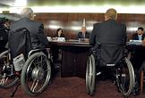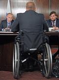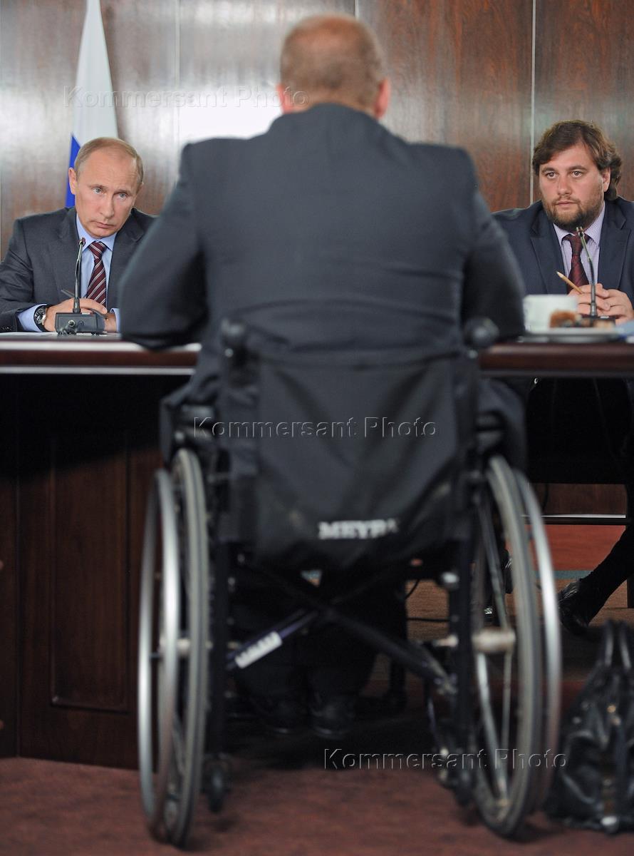 Председатель правительства России Владимир Путин (слева) и вице-президент Федерации дзюдо Москвы Дмитрий Кузнецов (справа) во время встречи с представителями общественных организаций и обществ инвалидов России. Встреча прошла в зале президиума Дома правительства России.