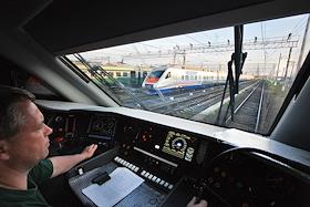 Машинист в кабине пассажирского двухсистемного электропоезда Allegro на Финском вокзале.