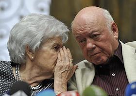 Директор Государственного музея изобразительных искусств (ГМИИ) имени А.С.Пушкина Ирина Антонова (слева) и театральный художник Борис Мессерер (справа) на пресс-конференции, посвященной открытию выставки испанского художника Сальвадора Дали. Пресс-конференция и открытие выставки состоялись в ГМИИ имени А.С.Пушкина.
