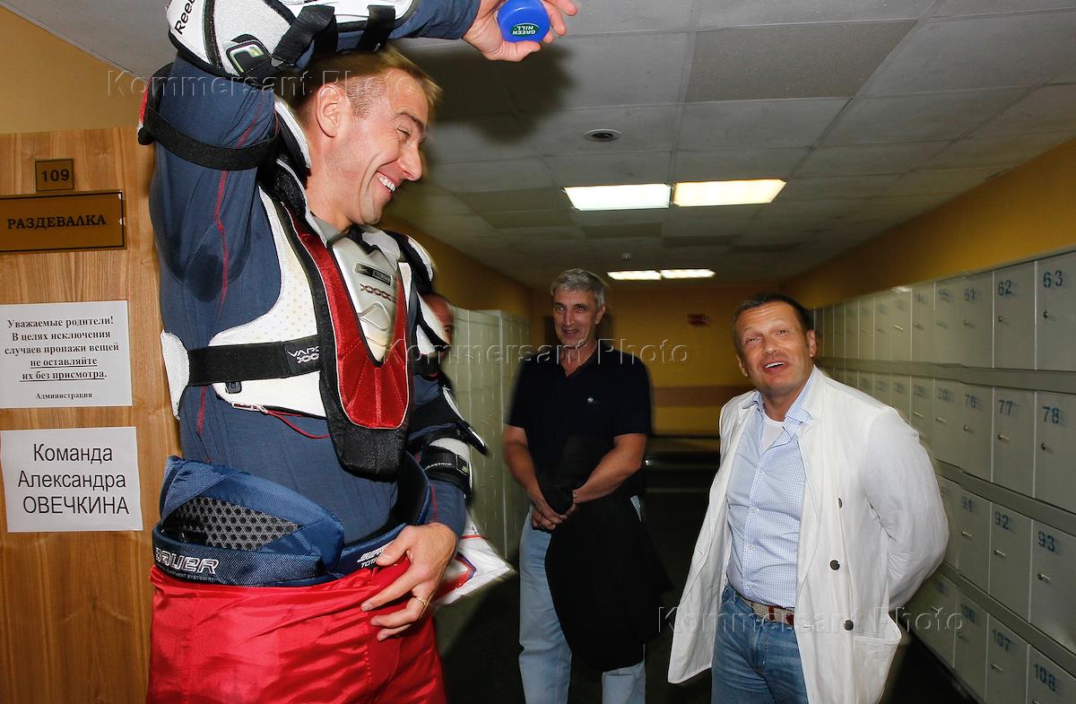 Нападающий сборной России по хоккею и клуба "Вашингтон Кэпиталс", чемпион мира Александр Овечкин (слева) и генеральный директор Агентства по ипотечному жилищному кредитованию Александр Семеняка (справа) перед началом благотворительного матча по хоккею "Под флагом добра" во Дворце спорта "Сокольники".