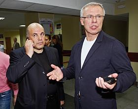 Директор Департамента министерства экономического развития России Сергей Беляков (слева) и президент группы компаний "Каскол" Сергей Недорослев (справа) перед началом благотворительного матча по хоккею "Под флагом добра" во Дворце спорта "Сокольники".