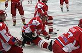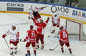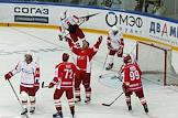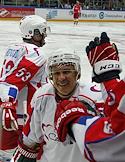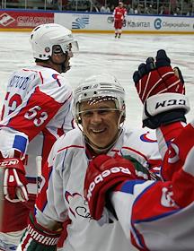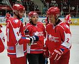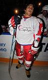 Нападающий ФК "Локомотив" Дмитрий Сычев (третий слева), мэр Казани Ильсур Метшин (четвертый слева), вице-президент Федерации тенниса России, теннисист Марат Сафин (третий справа), вице-президент "Промсвязьбанка" Руслан Екшенбеев (второй справа) и капитан сборной России по хоккею, нападающий ХК "Ак Барс", двухкратный чемпион Мира Алексей Морозов (справа) во время благотворительного матча по хоккею "Под флагом добра" во Дворце спорта "Сокольники".