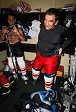 Вице-президент Федерации тенниса России, теннисист Марат Сафин (слева) и джазмен Игорь Бутман (справа) во время благотворительного матча по хоккею "Под флагом добра" во Дворце спорта "Сокольники".