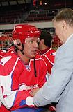 Представитель Приморского края в Совете Федерации России, председатель совета директоров КХЛ Вячеслав Фетисов (слева) и тренер по хоккею Виктор Тихонов (справа) во время благотворительного матча по хоккею "Под флагом добра" во Дворце спорта "Сокольники".