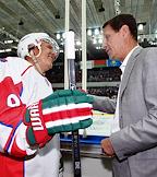 Президент группы компаний "Каскол" Сергей Недорослев (слева) и президент Республики Татарстан Рустам Минниханов (справа) во время благотворительного матча по хоккею "Под флагом добра" во Дворце спорта "Сокольники".