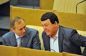 Председатель Комитета Государственной думы (ГД) России по строительству и земельным отношениям Мартин Шаккум (слева) и заместитель председателя комитета ГД по информационной политике, информационным технологиям и связи, певец Иосиф Кобзон (справа) во время пленарного заседания ГД.