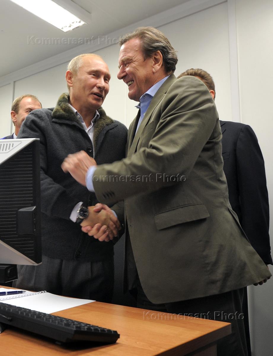 Председатель комитета акционеров компании "Северный Поток" (Nord Stream) Герхард Шредер (слева) и председатель правительства России Владимир Путин (в центре) во время торжественной церемонии заполнения трубопровода "Северный поток" технологическим газом.