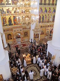 Поминальная служба и молебен о погибших во время крушения самолета Як-42 авиакомпании "Як-сервис" основного состава хоккейной команды ярославского "Локомотива". Служба прошла в Успенском кафедральном соборе.