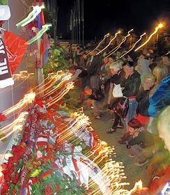 Болельщики ярославской хоккейной команды "Локомотив", погибшей в авиакатастрофе на самолете Як-42 авиакомпании "Як-сервис" 7 сентября 2011 года в Ярославле, во время возложения цветов и зажигания свечей у стадиона "Арена-2000" в память о погибших.