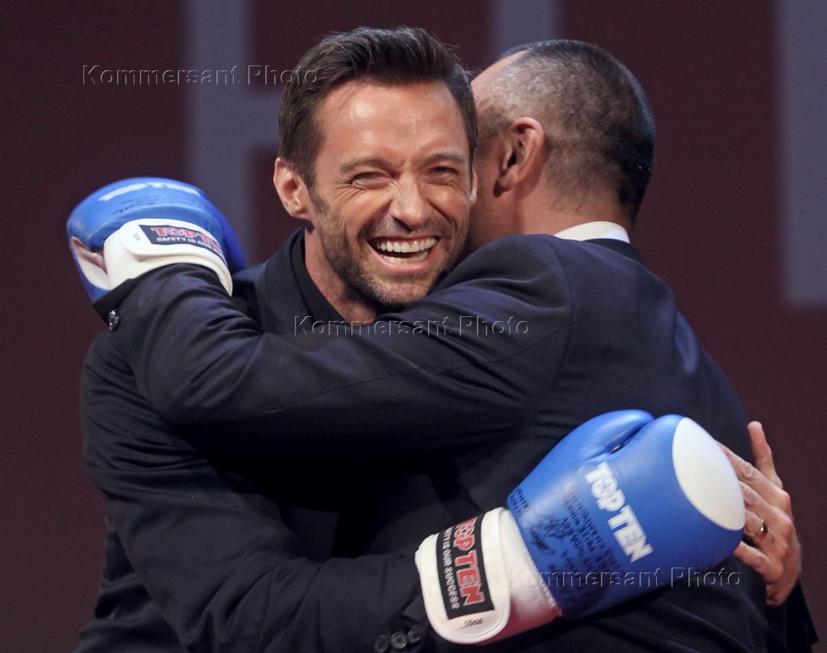 Актер Хью Джекман (слева) и член президиум Федерации бокса России Александр Лебзяк (справа) на премьере фильма режиссера Шона Леви "Живая сталь" в кинотеатре "Октябрь".