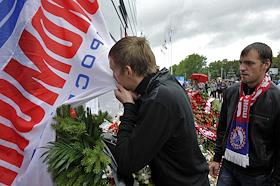 Болельщики ярославской хоккейной команды "Локомотив", погибшей в авиакатастрофе на самолете Як-42 авиакомпании "Як-сервис" 7 сентября 2011 года в Ярославле, во время возложения цветов к стене стадиона "Арена-2000".