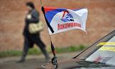 Флаг с траурной лентой на автомобиле в память о игроках ярославской хоккейной команды "Локомотив", погибших в авиакатастрофе на самолете Як-42 авиакомпании "Як-сервис" 7 сентября 2011 года в Ярославле.