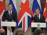 Президент России Дмитрий Медведев (слева) и премьер-министр Соединенного Королевства Великобритании и Северной Ирландии Дэвид Кэмерон (справа) во время совместной пресс-конференции по итогам встречи. Встреча прошла в Кремле.