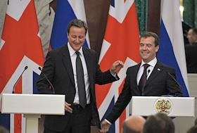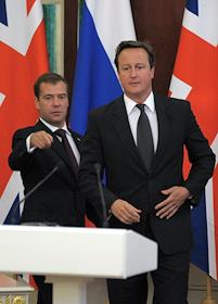 Президент России Дмитрий Медведев (слева) и премьер-министр Соединенного Королевства Великобритании и Северной Ирландии Дэвид Кэмерон (справа) во время встречи в Кремле.