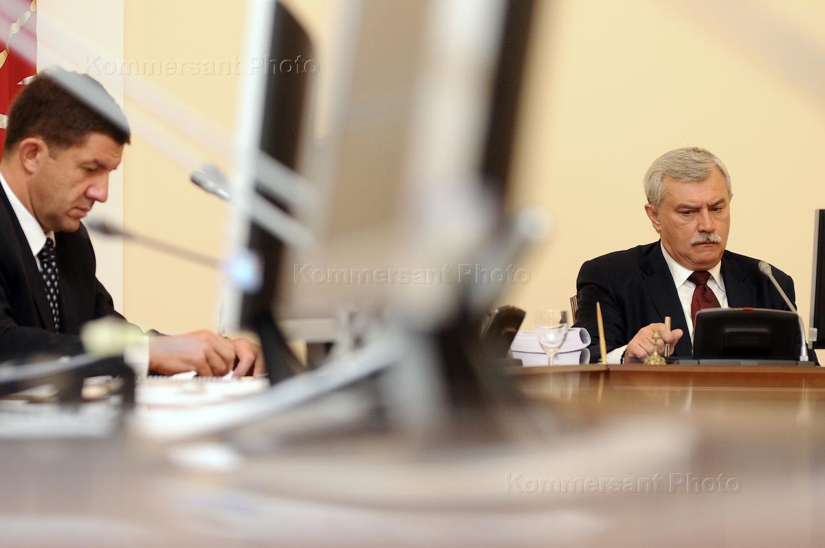 Вице-губернатор Санкт-Петербурга Михаил Осеевский (слева) и губернатор Санкт-Петербурга Георгий Полтавченко (справа) во время первого заседания правительства Санкт-Петербурга под руководством нового губернатора.