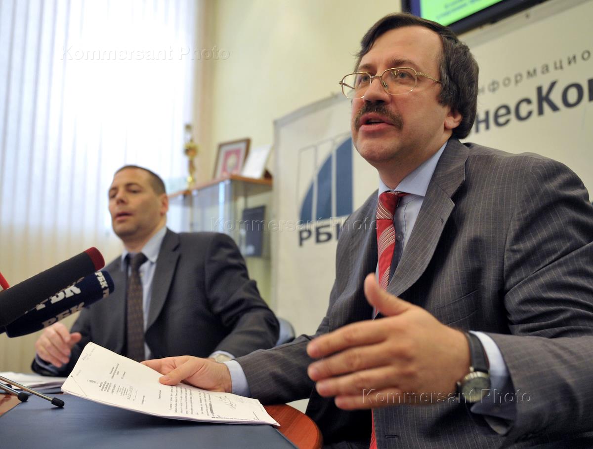 Начальник управления контроля госзаказа Федеральной антимонопольной службы (ФАС) Михаил Евраев (слева)и заместитель руководителя Федеральной антимонопольной службы (ФАС) Андрей Цариковский (справа) во время пресс-конференции на тему: "Законопроект ФАС по совершенствованию госзаказа". Пресс-конференция прошла в информационном агентстве "РосБизнесКонсалтинг".