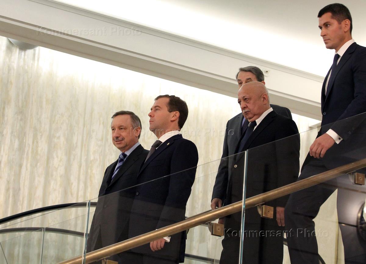 Заместитель главы администрации президента России Александр Беглов (слева), президент России Дмитрий Медведев (второй слева), министр культуры России Александр Авдеев (в центре) и генеральный директор Государственного академического Большого театра (ГАБТ) Анатолий Иксанов (второй справа) во время посещения ГАБТ, который 28 октября открывается после масштабной реконструкции.