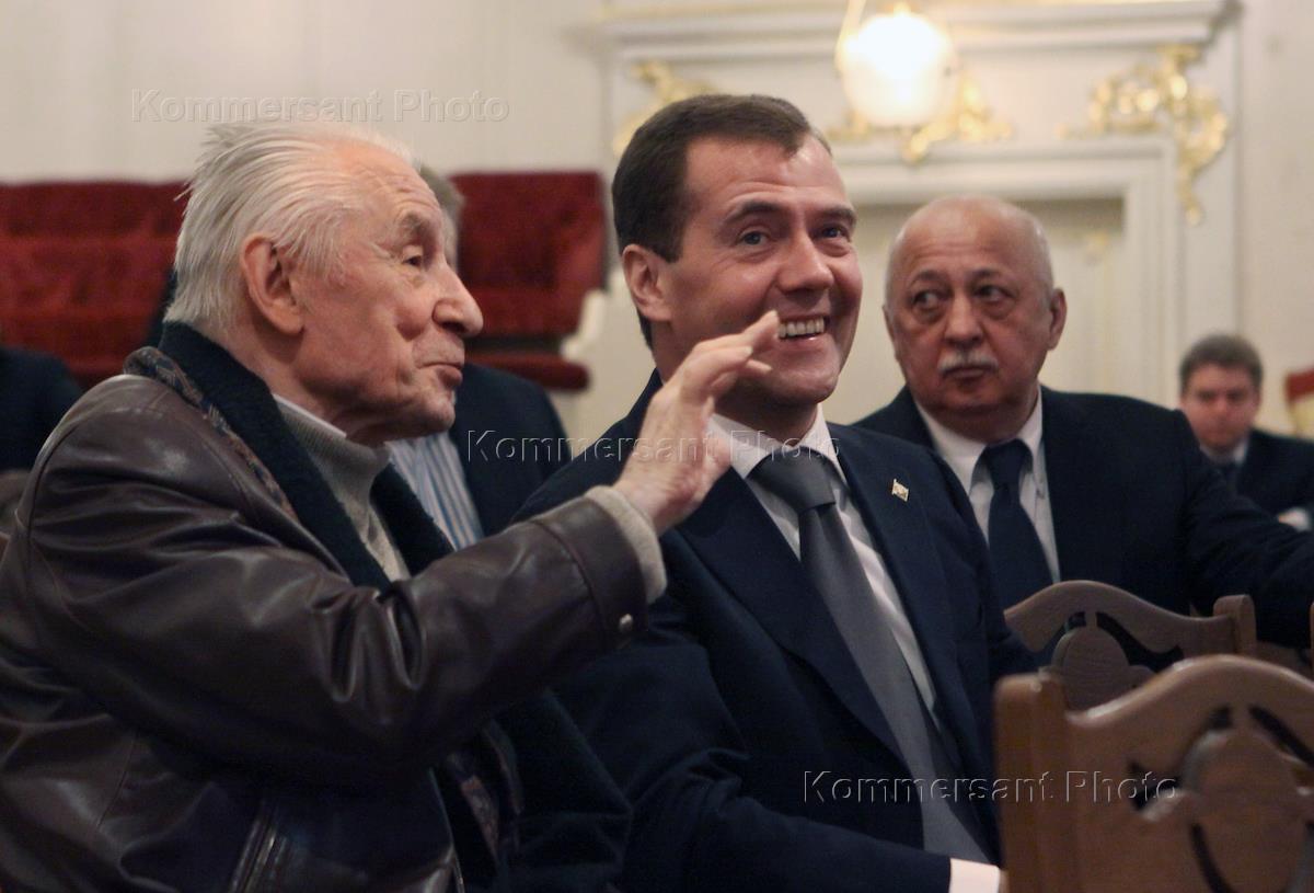 Балетмейстер Юрий Григорович (слева), президент России Дмитрий Медведев (в центре) генеральный директор Государственного академического Большого театра (ГАБТ) Анатолий Иксанов (справа) во время посещения ГАБТ, который 28 октября открывается после масштабной реконструкции.