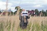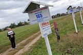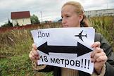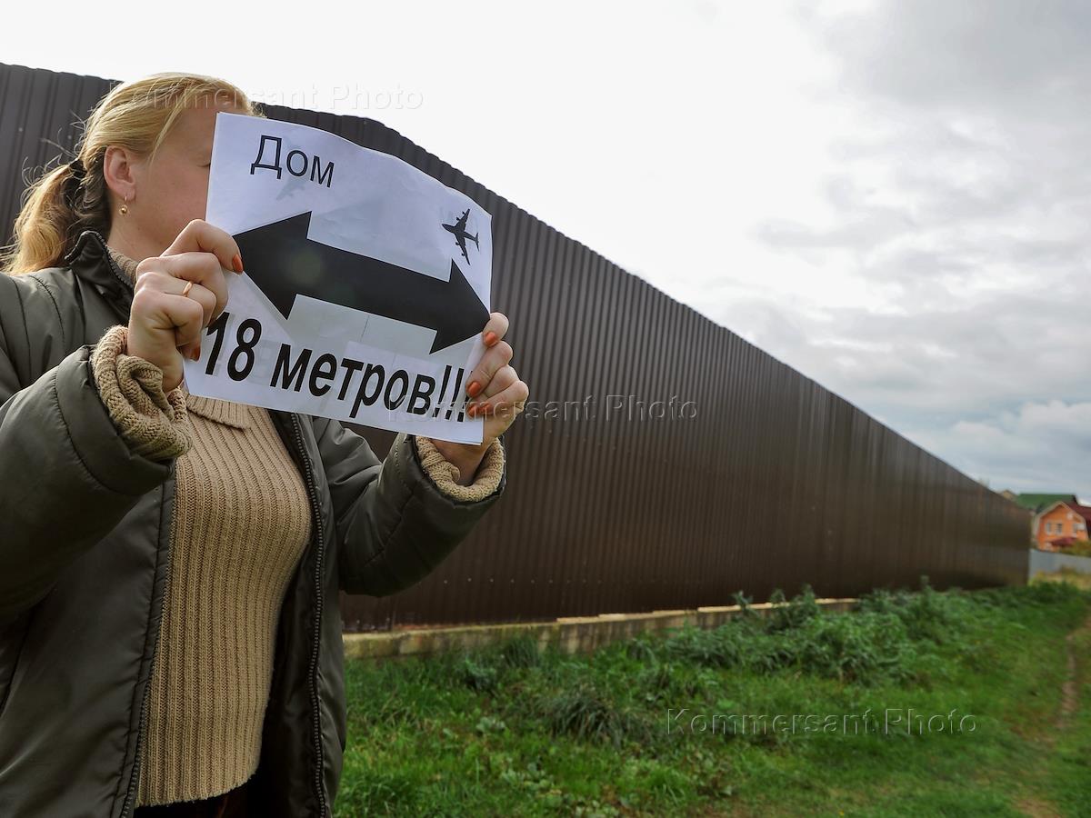 Населенный пункт Дубровки. Женщина держит плакат с указанием расстояния в 18 метров между самолетами и домами.