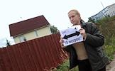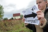 Населенный пункт Дубровки. Женщина держит плакат с указанием расстояния в 18 метров между самолетами и домами. Табличка "Нефтепродуктопровод".