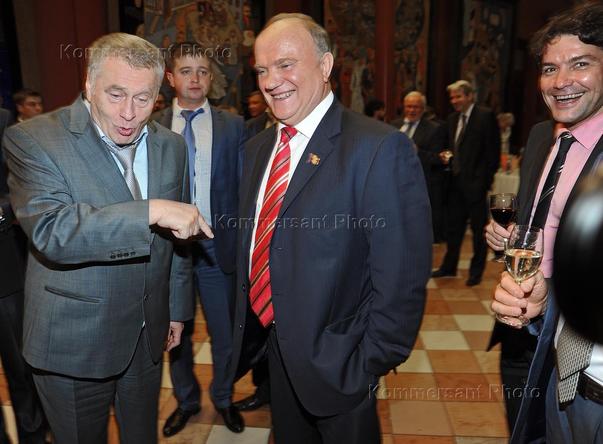 Лидер Либерально-демократической партии России (ЛДПР), заместитель председателя Государственной думы России Владимир Жириновский (слева) и лидер Коммунистической партии России (КПРФ) Геннадий Зюганов (в центре) на праздновании дня рождения радиостанции "Эхо Москвы" в Галерее искусств Зураба Церетели.