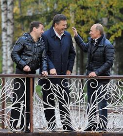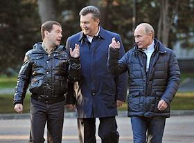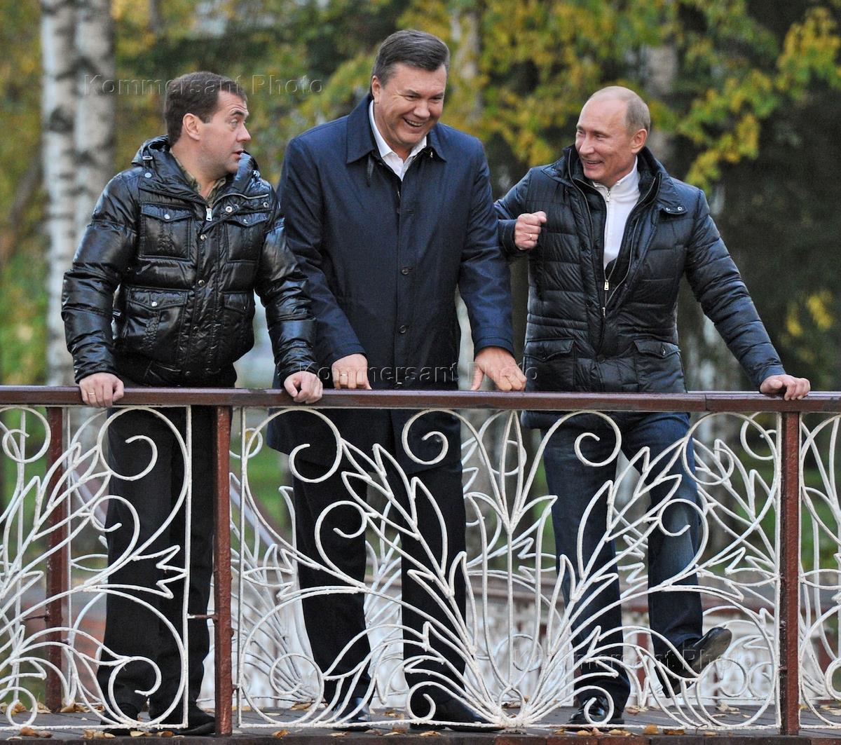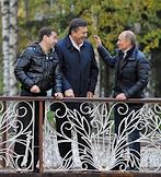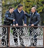 Президент России Дмитрий Медведев (слева), президент Украина Виктор Янукович (в центре) и председатель правительства России Владимир Путин (справа) во время прогулки в государственной резиденции "Русь" в "Завидово".